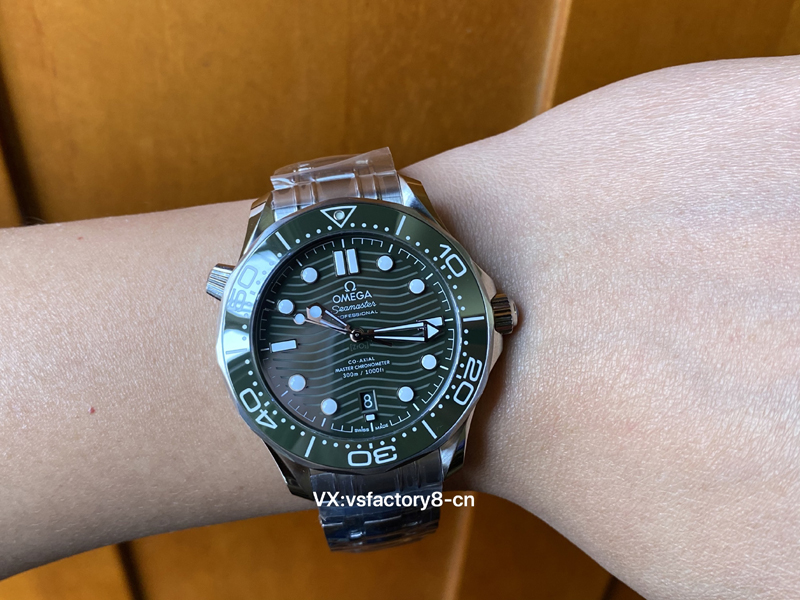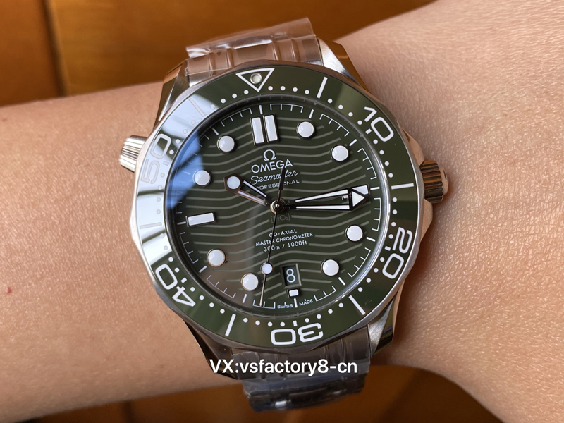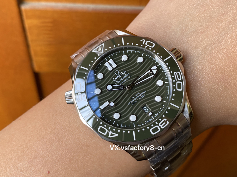3:VS工廠購入了歐米茄綠面海馬300米正品開版,表圈上,同步了正品一致綠色陶瓷表圈,飾以白色琺瑯潛水刻度,字圈刻度不易磨損掉色,棘輪式倒計時表圈逆時針單向轉動。表盤這方面,拋光綠色陶瓷表盤,激光鐫刻波紋圖案,6點鐘位置設有日歷窗口,鏤空指針和浮雕小時刻度經鍍銠處理,并覆以Super-LumiNova夜光涂層,藍綠雙色夜光,分針綠色夜光顯示配合表圈綠色夜光點用于潛水氧氣倒計時。