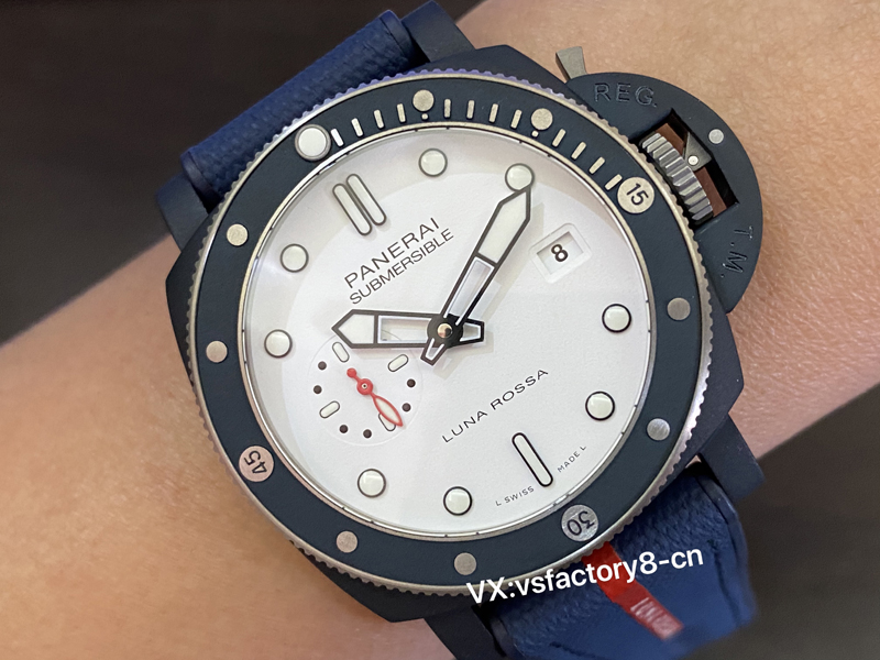 4:表鏡采用藍(lán)寶石水晶,耐磨抗刮,確保復(fù)刻表在日常使用中的耐用性與美觀性,VS廠沛納海1543的表盤采用經(jīng)典的白色設(shè)計(jì),表盤上印有清晰英文印刷字和條形時標(biāo),配合夜光涂層,大大提升了夜間的可讀性,白色的表盤配Ti-Ceramitech陶瓷材質(zhì),完全展現(xiàn)了復(fù)刻表的顏值性。