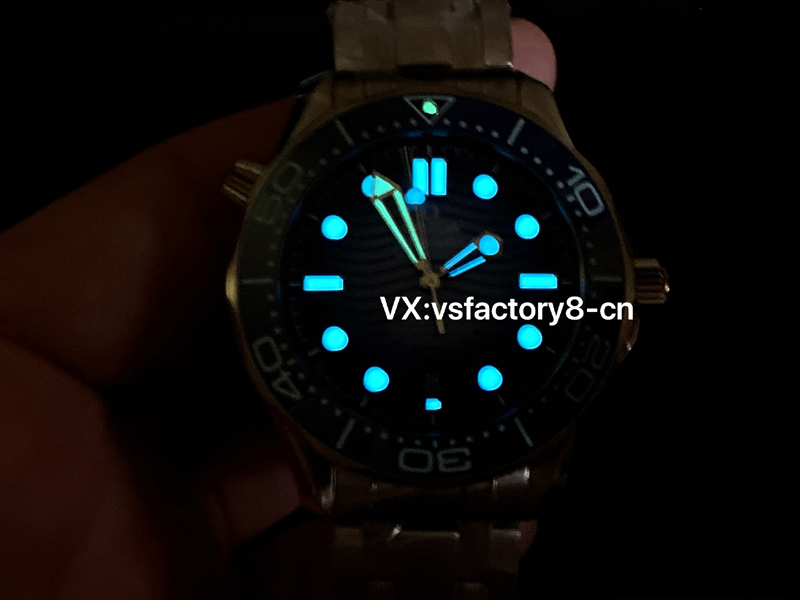 3:表圈的還原非常高,VS工廠在此款歐米茄漸變冰藍面海馬300米復(fù)刻表研發(fā)燒制的陶瓷材質(zhì),Summer Blue色調(diào)的琺瑯潛水刻度,亦采用“大明火”工藝燒制而成,這一點還原的非常對版,也不會出現(xiàn)色差和一眼假,同步原版一致細(xì)節(jié)工藝還原!