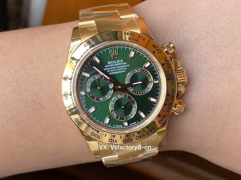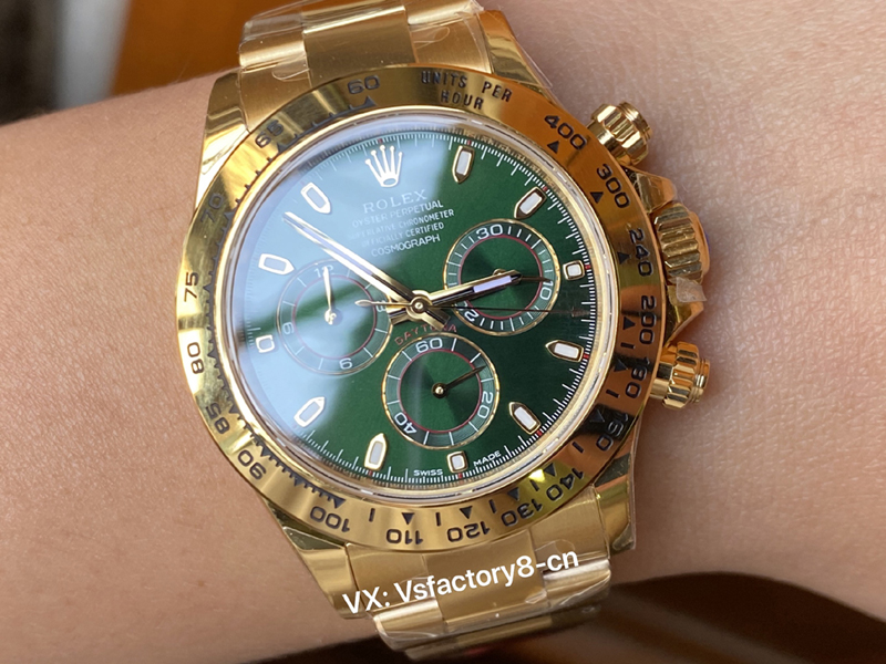 4:同時,VS廠勞力士綠金迪的表盤的英文印刷細(xì)節(jié)做工非常均勻,三個綠色計時小圓盤還原的非常細(xì)致,指針和刻度均無瑕疵現(xiàn)象,并且填充了進(jìn)口瑞士夜光粉,此外,表殼右側(cè)設(shè)有正品一致三把頭,全面經(jīng)過真空電鍍18K金,整體看起來非常有質(zhì)感,二點(diǎn)位置把頭則是計時開關(guān),三點(diǎn)位置則是調(diào)時間,上發(fā)條,四點(diǎn)位置則是計時歸為,功能完全對版,非常值得入手。