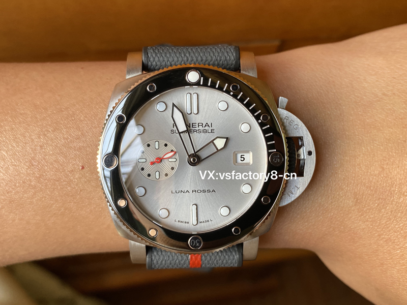 4:VS廠沛納海pam1681復(fù)刻表的表盤飾有“Luna Rossa”字樣,表圈的夜光圓點(diǎn)、指針與時(shí)標(biāo)均涂覆Super-LumiNova?夜光涂層,VS廠沛納海PAM01681最引人矚目的工藝特點(diǎn)則是小秒盤上的環(huán)形雕紋,該細(xì)致紋路是利用特殊工具在表盤鑿刻數(shù)圈同心圓,創(chuàng)造出猶如波浪起伏的視覺(jué)效果,為表面增添立體層次與紋理質(zhì)感。