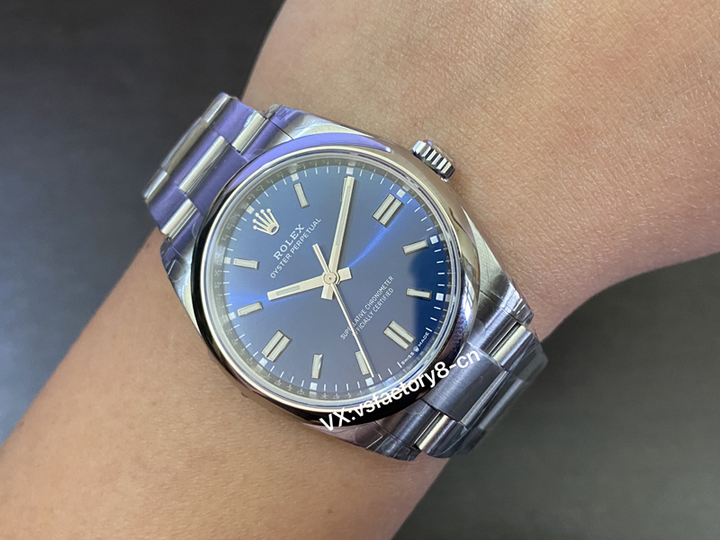 4:VS廠復(fù)刻的勞力士藍(lán)面蠔式恒動(dòng)在表盤設(shè)計(jì)上力求精確還原,表盤采用與原裝一致放射紋藍(lán)色還原,光澤度與原版幾乎一致,更值得一提的是,VS廠對(duì)表盤上細(xì)微細(xì)節(jié)更加還原,指針的長(zhǎng)度和形狀,甚至是夜光涂層,均經(jīng)過(guò)嚴(yán)格測(cè)試,確保能夠與原版一致,VS廠在表盤上每一次的細(xì)致復(fù)刻都是為了更接近勞力士的工藝標(biāo)準(zhǔn),滿足表友對(duì)品質(zhì)與細(xì)節(jié)的追求。