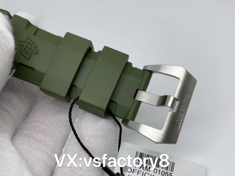 7:VS廠沛納海PAM1055潛行系列復(fù)刻表配備了與原版相同材質(zhì)的軍綠色橡膠帶,既柔軟舒適又具備良好的耐磨性能。表帶的寬度設(shè)計(jì)和曲線也經(jīng)過仔細(xì)打磨,呈現(xiàn)出與原版一致的細(xì)節(jié)和工藝,此外,在表扣具上,VS廠同樣不忽視細(xì)節(jié)之處,采用316L精鋼針扣復(fù)刻還原設(shè)計(jì),而且,扣具的打磨工序經(jīng)過嚴(yán)格把控,讓每個(gè)細(xì)節(jié)都達(dá)到完美呈現(xiàn)。