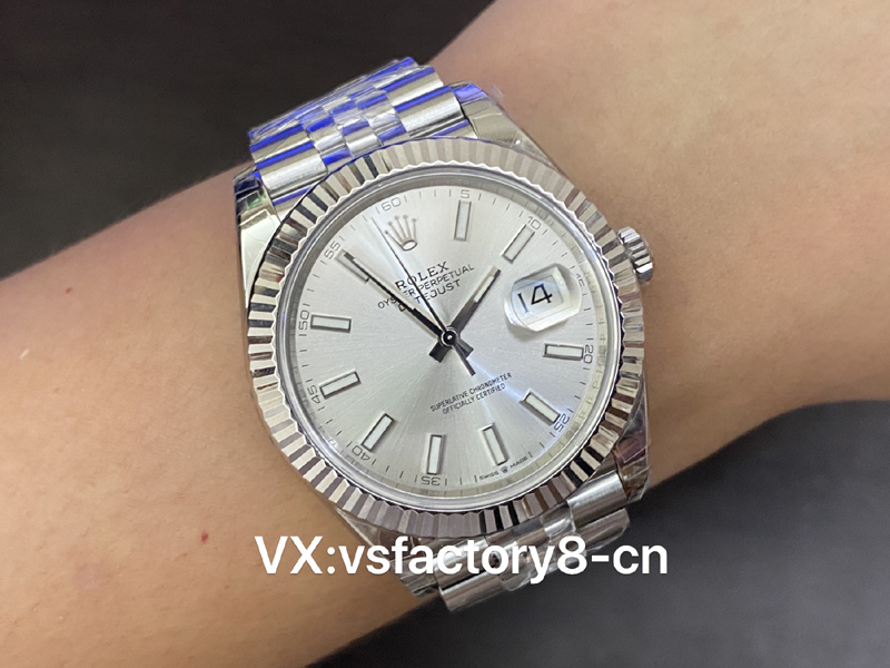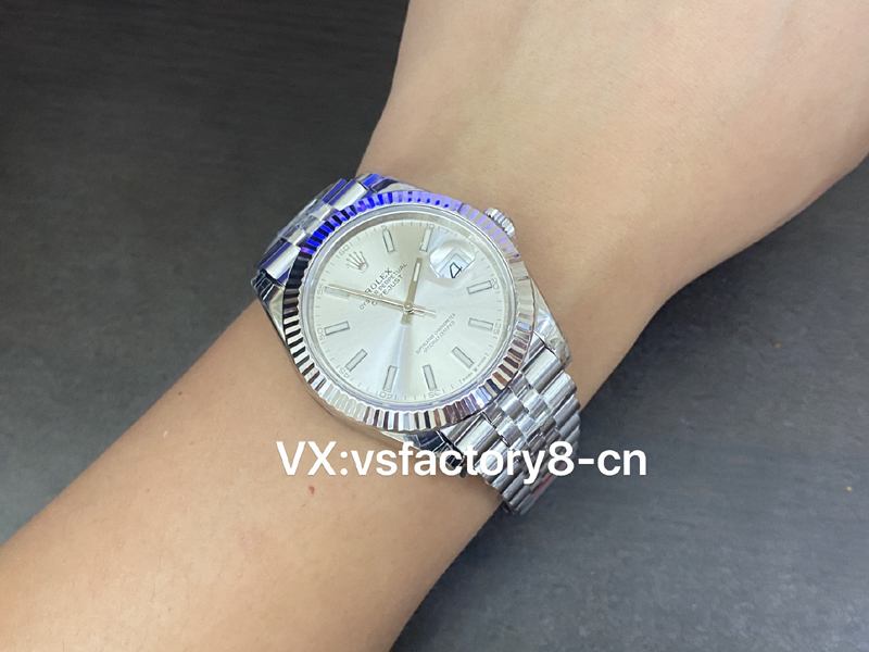 5:VS廠復刻的勞力士銀盤日志復刻表,還原與原版銀色底盤一致,表盤呈現(xiàn)出極致的光澤感,陽光下閃爍出迷人的放射紋,真正達到了最高版本,清晰度和立體感都非常出色。表盤上刻有的時標和指針均采用了瑞士夜光粉涂層效果一致,盤面英文印刷細節(jié)非常精湛,十二點大皇冠LOGO非常的立體。