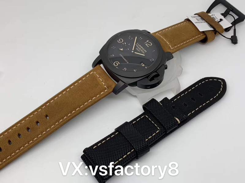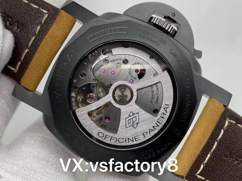2:VS廠沛納海pam441的外觀表殼還原一致正品陶瓷材質(zhì),經(jīng)過(guò)啞光處理之后,可以襯托出表盤的絕佳觀感享受,展現(xiàn)出磨砂質(zhì)感的光澤,材質(zhì)相比,陶瓷質(zhì)地要更加堅(jiān)硬、耐腐蝕一些,這一點(diǎn)做到了完全對(duì)版正品,表殼的直徑同步一致44mm,粗獷有力,非常符合男士表友入手。