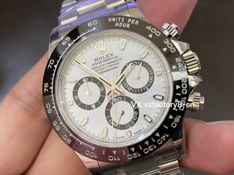 5:在表盤(pán)的復(fù)刻還原設(shè)計(jì)上,VS廠不僅忠實(shí)還原了正品的細(xì)節(jié),還在表盤(pán)方面進(jìn)行了優(yōu)化,使其在視覺(jué)上更具吸引力,一致“死白色”鍛造還原,黑色計(jì)時(shí)盤(pán)和白色表盤(pán)形成鮮明對(duì)比,被稱(chēng)為“熊貓”稱(chēng)號(hào),VS廠采取了實(shí)心中軸,十二點(diǎn)大皇冠LOGO立體強(qiáng)烈,表盤(pán)印刷細(xì)節(jié)處理的非常完美,指針和刻度均填充了瑞士夜光粉涂層,效果一致原版。