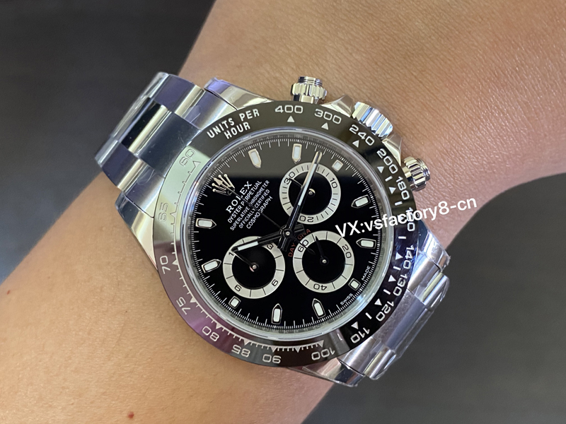 4:VS廠勞力士迪通拿黑陶迪的表盤復(fù)刻還原設(shè)計最高,同步一致黑色搪瓷材質(zhì)鍛造,搭載了細(xì)膩的白色計時圈,形成了鮮明的對比,使得視覺效果極其出眾。雖然是復(fù)刻表,但是每個細(xì)節(jié)都力求完美,表盤的三、六、九點位置,表盤上的指針與時標(biāo)均經(jīng)過拋光處理,光澤感極佳,VS廠更是細(xì)致到每個小刻度的刻畫,讓人難以分辨與正品之間的差距。