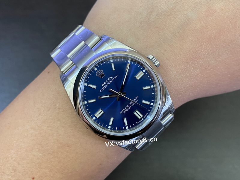 4:VS廠在勞力士蠔式恒動復刻表同步原版一致藍色表盤還原設計,藍色的表盤在光線的折射下閃耀著迷人的光澤,奔馳針設計,刻度和指針邊緣均經過打磨圓潤,十二點位置大皇冠LOGO,立體感強烈,細長的時針和分針搭配著的纖細秒針,使得整個表盤的視覺效果尤為協(xié)調,均填充了瑞士夜光粉涂層,細節(jié)均勻,夜光顏色同步原版一致。