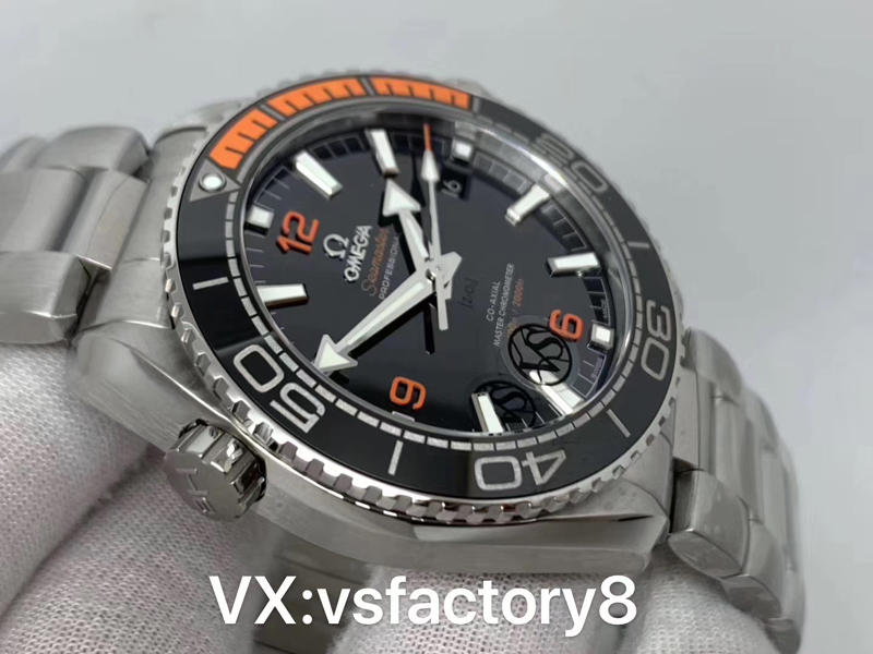 5:VS廠歐米茄四分之一橙海馬600米的表盤復(fù)刻還原設(shè)計(jì)是其最大的亮點(diǎn)之一,采取原版一致黑色搪瓷材質(zhì),其光澤感非常強(qiáng)烈,6,9,12采取了橙色阿拉伯?dāng)?shù)字刻度,時(shí)分秒指針長(zhǎng)度與正品一致剛好到字釘邊緣,刻度邊緣打磨圓潤(rùn),三點(diǎn)位置設(shè)有日歷窗,表盤英文印刷以及LOGO立體感非常強(qiáng)烈,刻度和指針均填充瑞士夜光粉涂層,均勻不溢出,做到了完全對(duì)版,非常值得入手。