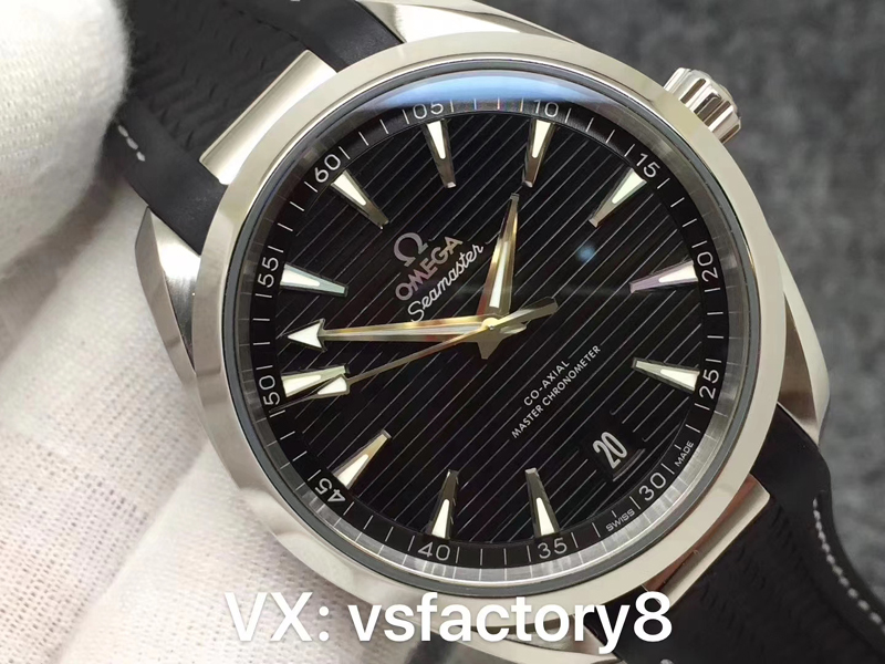 4:VS廠對歐米茄海馬150米的表盤復(fù)刻設(shè)計(jì)很精湛,表盤上采用了獨(dú)特的黑色柚木紋理,這一點(diǎn)具備原版一致原汁原味,質(zhì)感上非常強(qiáng)烈,柚木黑盤的紋路在陽光下閃爍著微妙的光澤,令人過目不忘。指針和時(shí)標(biāo)則使用了經(jīng)典的銀色,既提升了可讀性,表盤上的字母與標(biāo)記采用了高精度激光刻印工藝,字母的間距、形狀都與正品幾乎無異。這種細(xì)致入微的工藝處理,完美還原了正品的高檔感,指針和刻度打磨圓潤,均填充了瑞士夜光粉涂層,達(dá)到了原版一致效果。