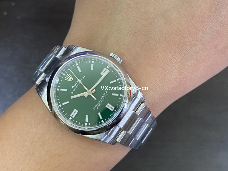 2:VS廠這款勞力士36m綠面蠔式恒動復刻表依舊還原了正版經典的蠔式結構還原設計,表殼使用了904L精鋼材質鍛造,表殼的打磨細膩,光滑的表面與拋光的邊緣形成鮮明對比,體現了VS廠工匠精神的完美,同步原版表殼直徑為36mm,適合男女大部分細小手腕。