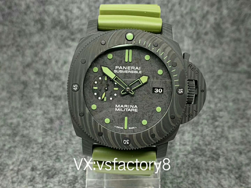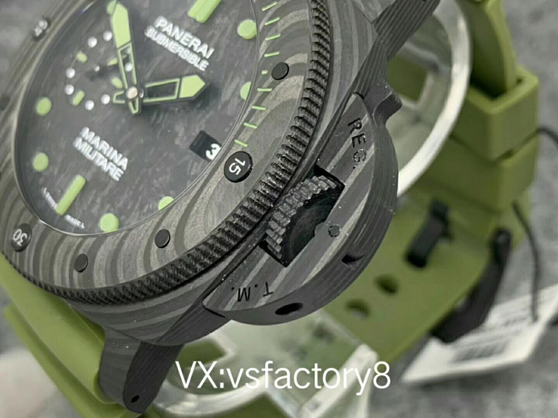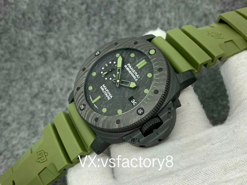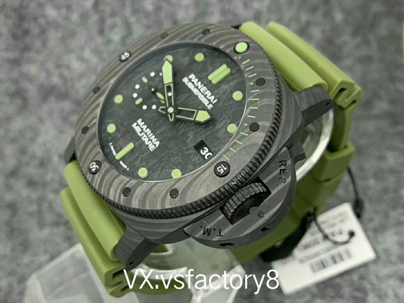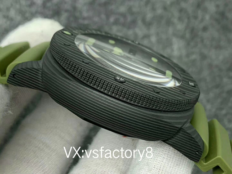 大理石花紋黑色碳纖?盤,深橄欖綠夜光時標、指針,天然橡膠表帶。