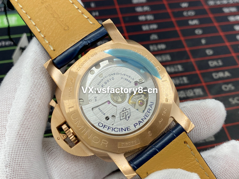 VS廠復(fù)刻表外觀其實(shí)跟其他沛納?;緵]什么區(qū)別,44mm的表徑,外觀也是精鋼進(jìn)行了真空電鍍,電鍍了18K金。