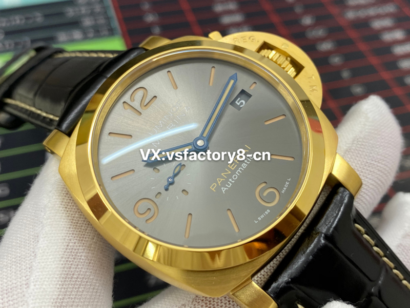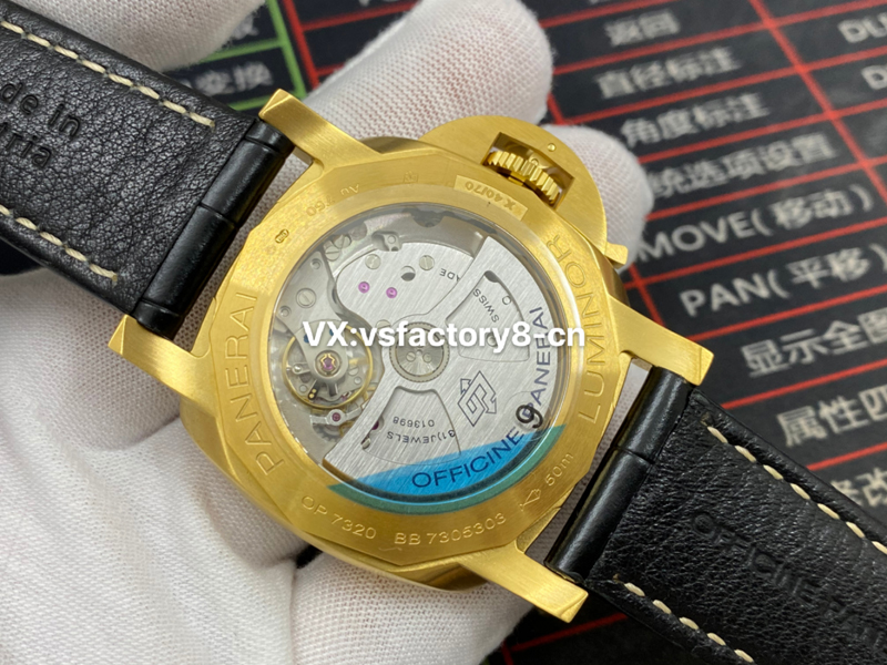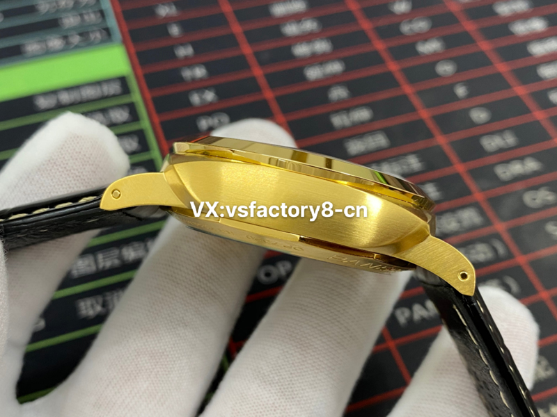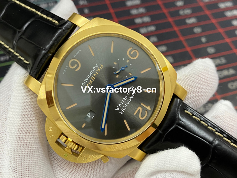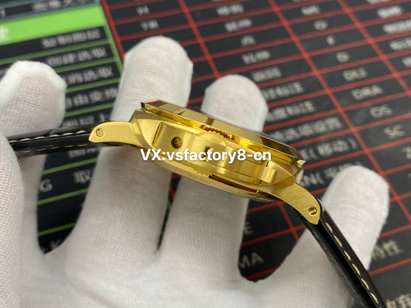 VS廠復刻表外觀其實跟其他沛納?;緵]什么區(qū)別,44mm的表徑,外觀也是精鋼進行了真空電鍍,電鍍了18K金。