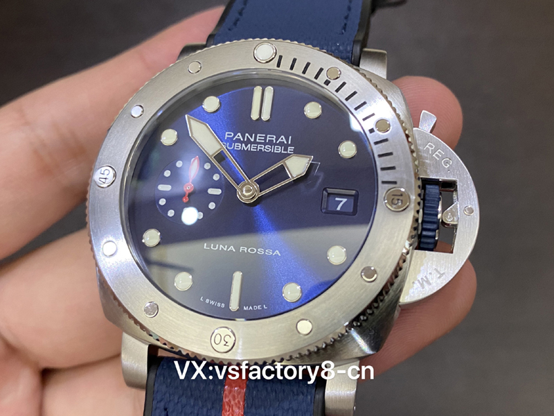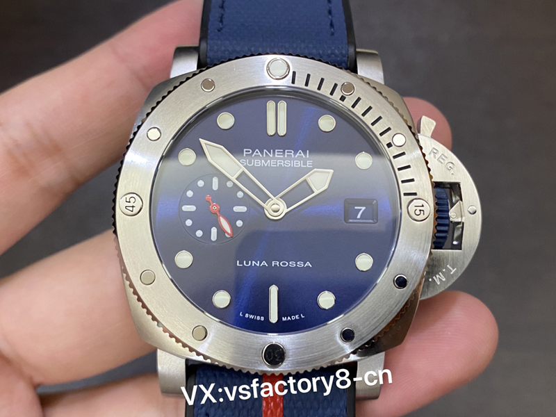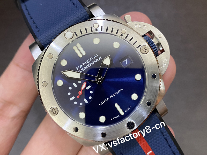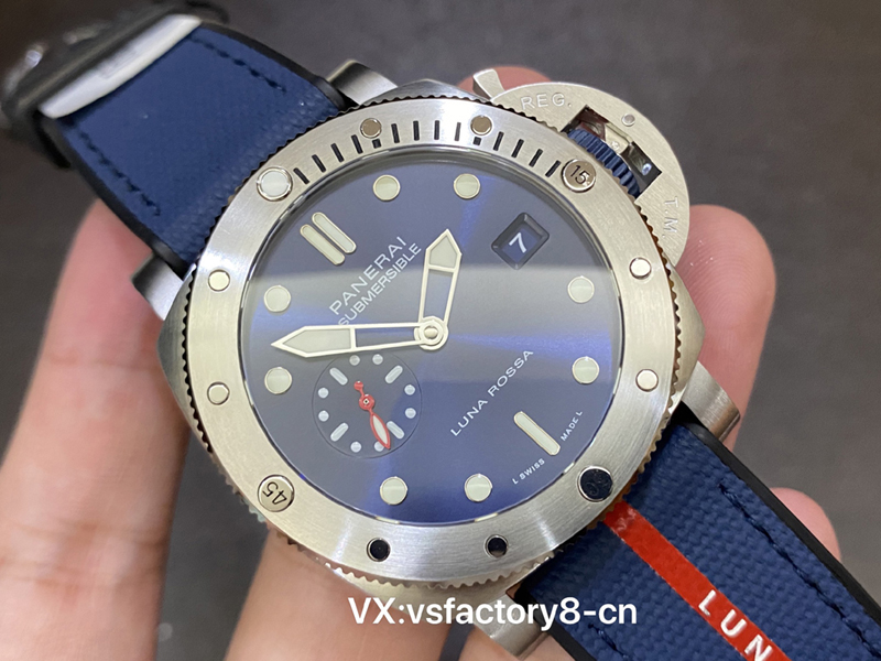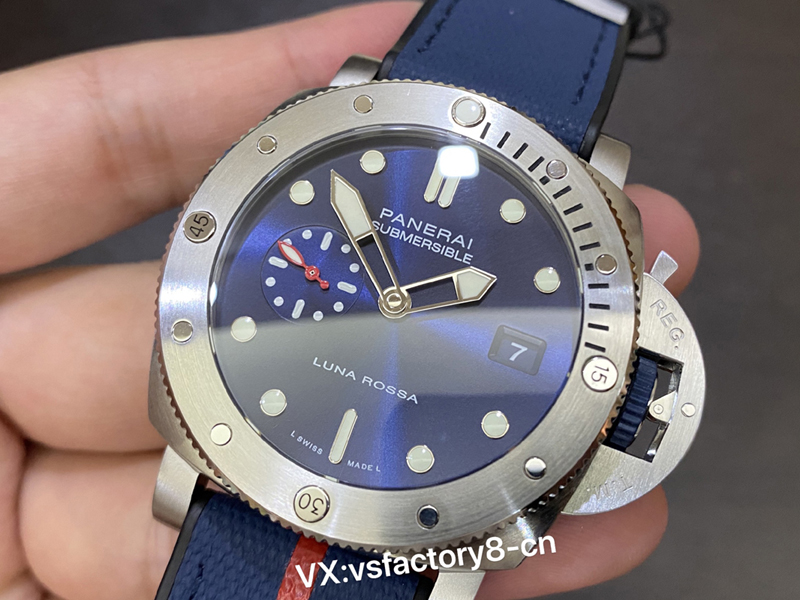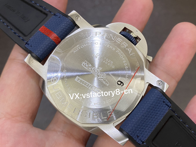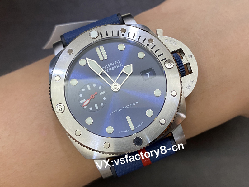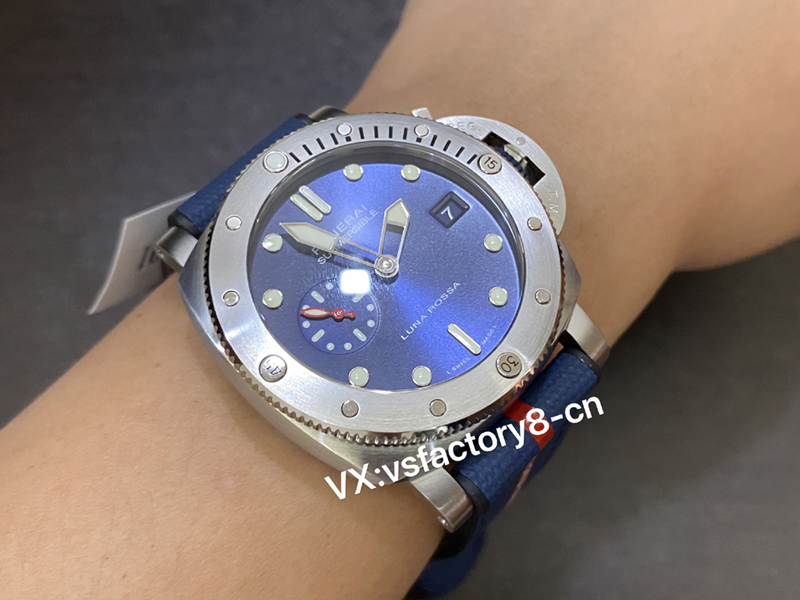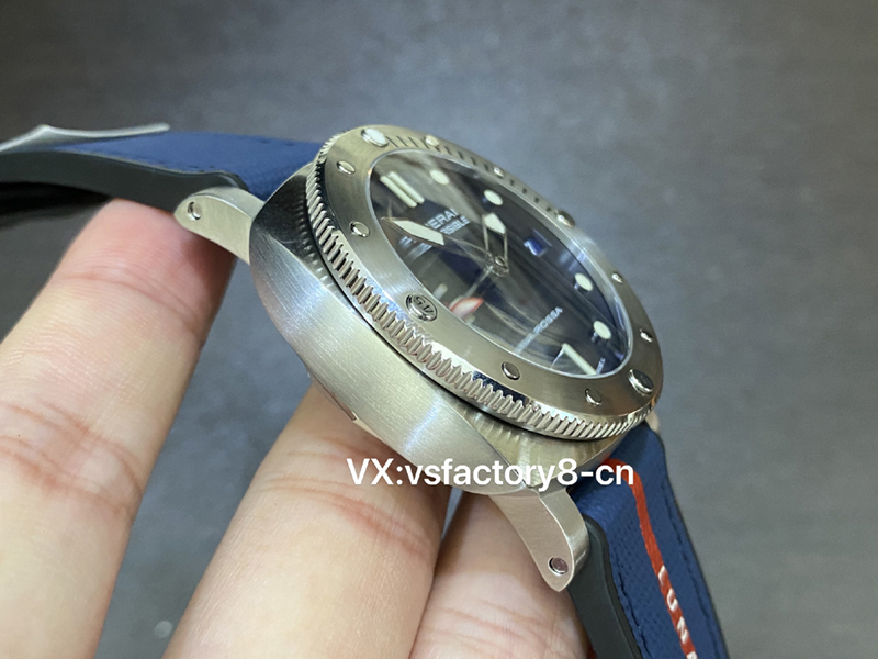 此次VS廠沛納海1391復(fù)刻版44毫米新的潛行腕表,都在在日期窗口做了一個細(xì)節(jié)升級,不是原來的盤面開口,而是做了內(nèi)凹倒梯形窗口,優(yōu)化過后日期數(shù)字顯示更清晰。