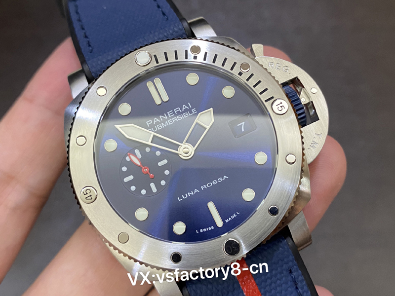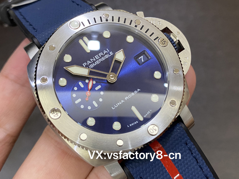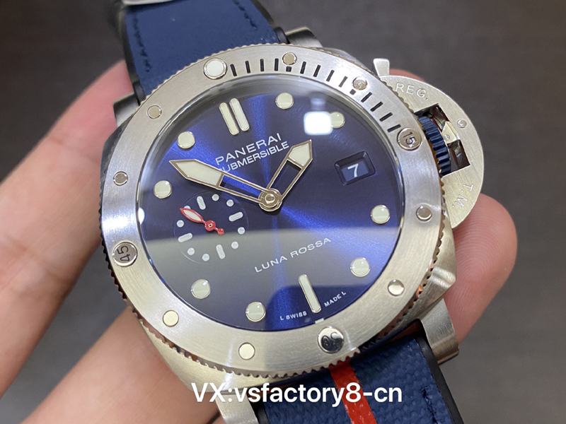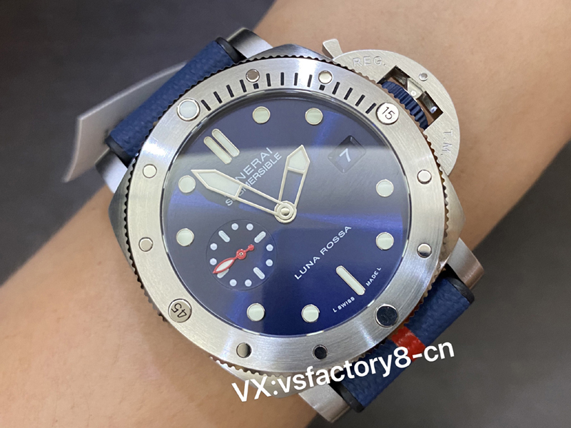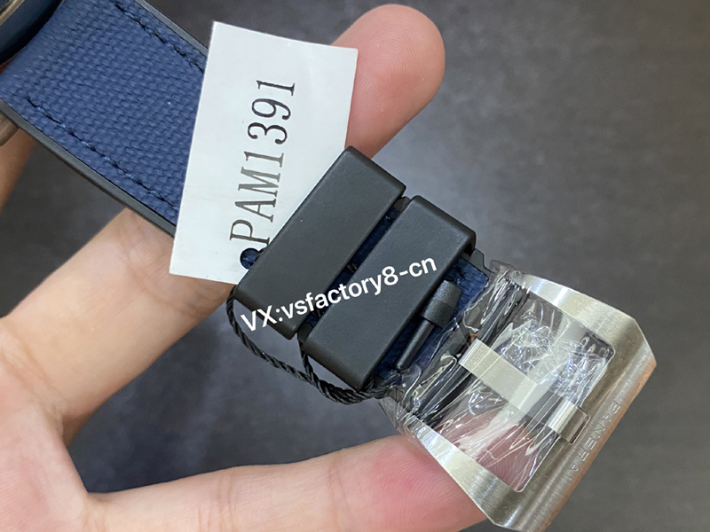 VS廠沛納海1391的字面采取藍(lán)色面,同正品沛納海1391做了太陽放射紋處理,會隨光照角度變化。