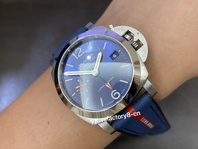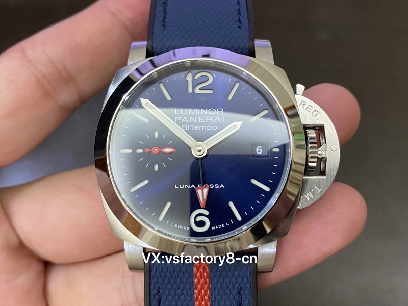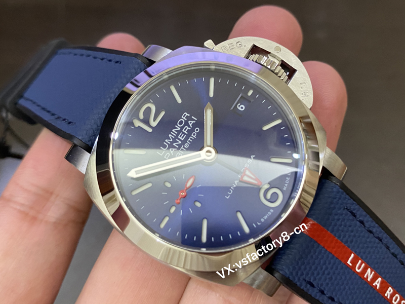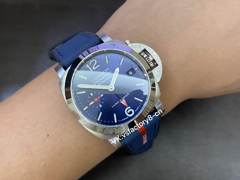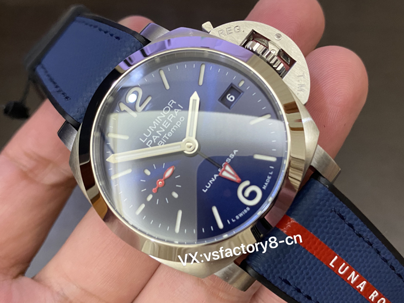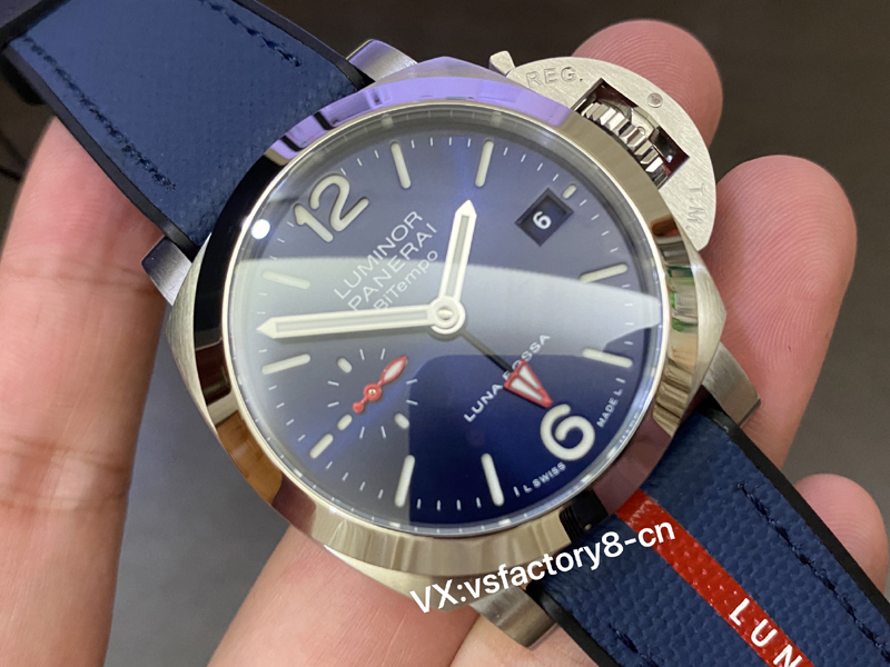 VS廠沛納海1404復(fù)刻表第二時區(qū)的時針尖端采用紅色鍍層處理,與Luna Rossa船隊的船帆顏色巧妙呼應(yīng)。
