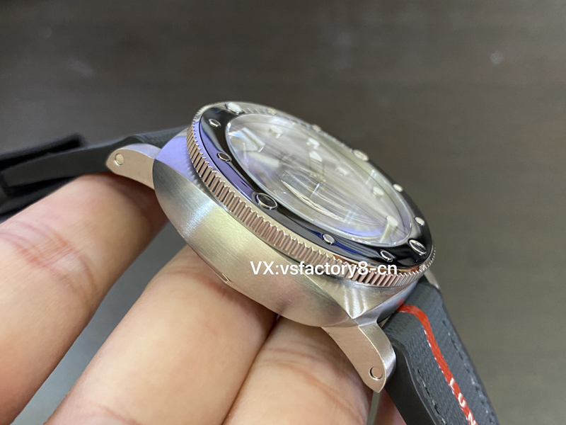 VS廠沛納海1681復刻表全面一致銀灰色基調(diào)搭配醒目的紅色點綴,盡顯內(nèi)斂沉穩(wěn)的氣,陶瓷內(nèi)圈更是彰顯質(zhì)感,灰色和紅色元素,與醒目的主色調(diào)交相輝映。