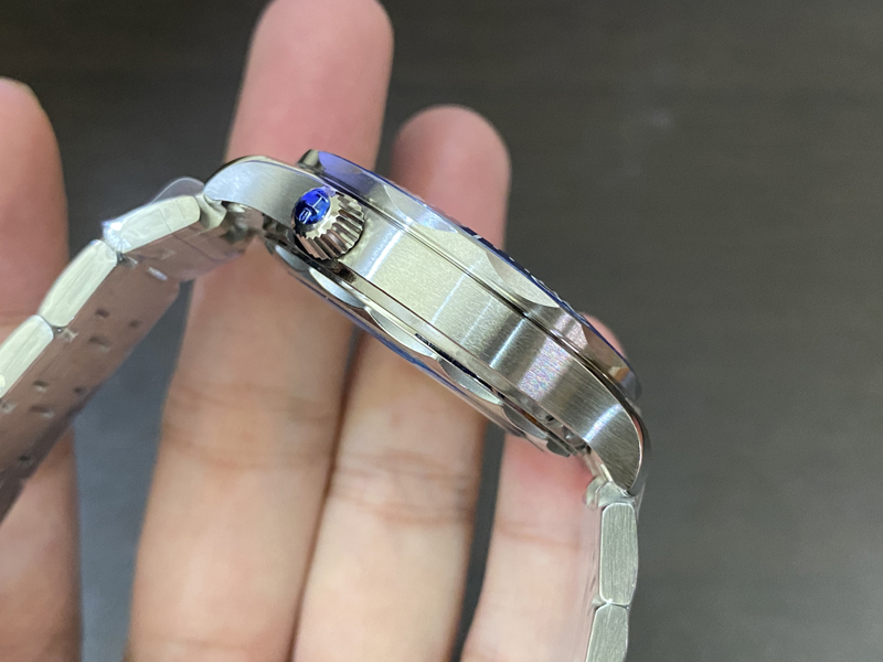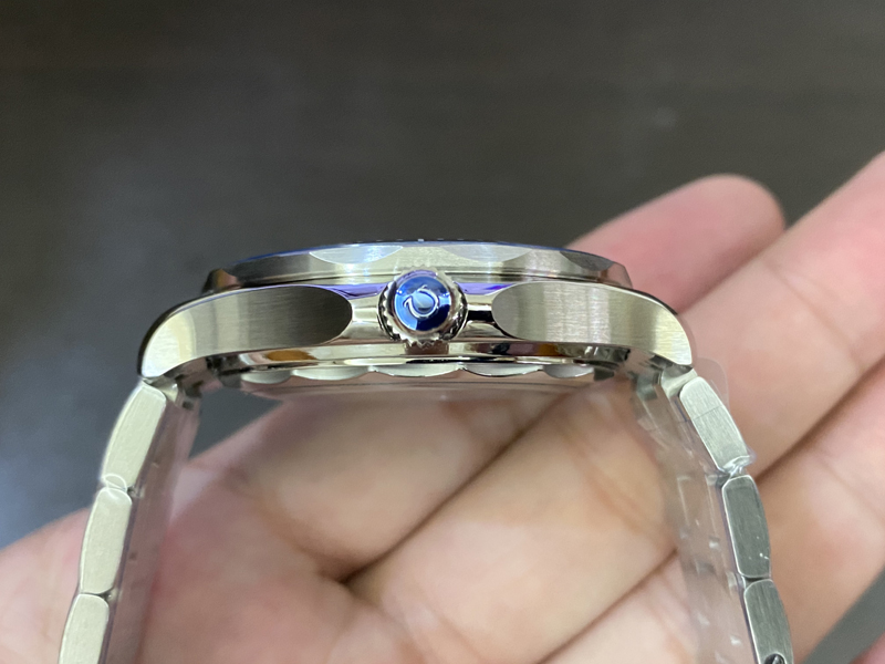 316L精鋼拉絲表殼局部拋光處理,表圈采用藍(lán)色陶瓷,飾以白色琺瑯潛水刻度,字圈刻度不易磨損掉色,棘輪式倒計時表圈逆時針單向轉(zhuǎn)動。
