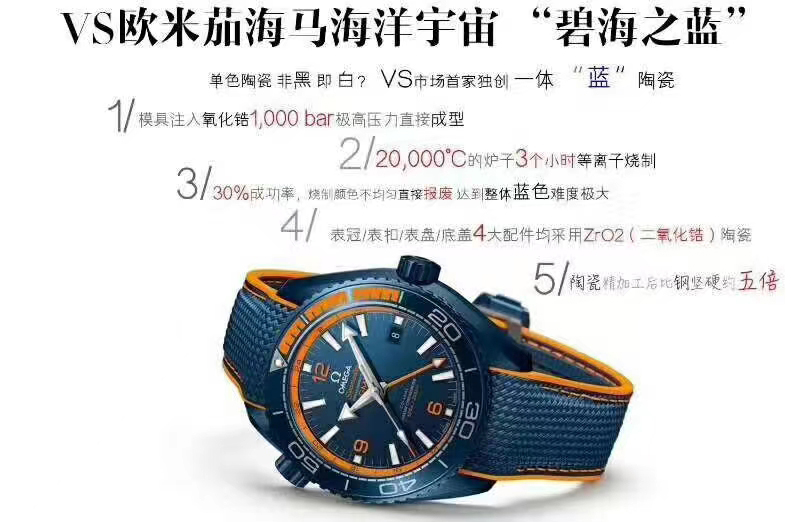 VS廠歐米茄碧海之藍(lán)海馬600米復(fù)刻表反復(fù)試驗(yàn)歷經(jīng)一年對(duì)比,以90%接近正品深藍(lán)色面市!殼身/表冠/表盤/扣/底蓋/圈口/均采用藍(lán)陶瓷,每個(gè)配件單獨(dú)燒結(jié)成型,打磨。