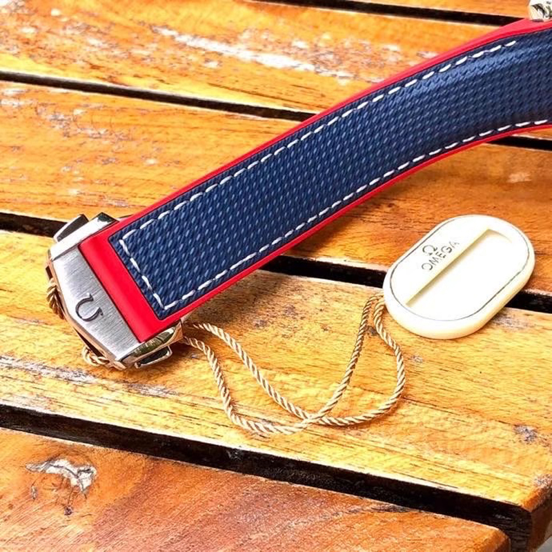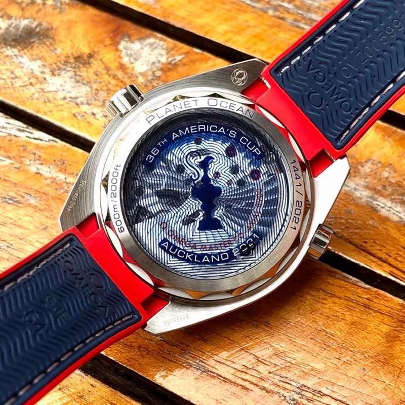 VS廠歐米茄43.5MM復刻表旨在致敬美洲杯帆船賽,歐米茄海馬表殼為不銹鋼材質打造,表圈的藍色則是藍色氧化鋯 (ZrO2) 也就是陶瓷表圈。