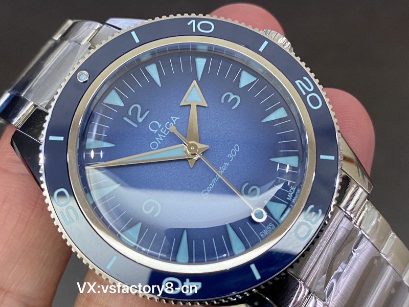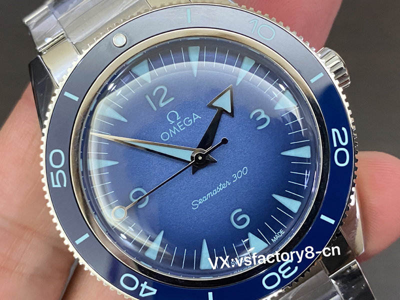 2024年VS廠手表官網全新產品歐米茄海馬300米幽靈黨冰藍面8912一體機,VS廠同步正品一致Summer Blue漸變表盤顏色略深,呼應腕表更高的防水深度。