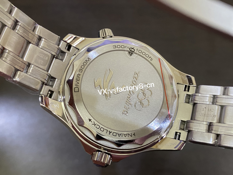 VS廠歐米茄海馬300米冬奧運(yùn)特別款經(jīng)拋光和拉絲處理的表背鐫刻有北京2022年冬奧會(huì)會(huì)徽,以及歐米茄特有的NAIADLOCK技術(shù),這一技術(shù)可以確保鐫刻的數(shù)字和圖案始終保持正確的位置。