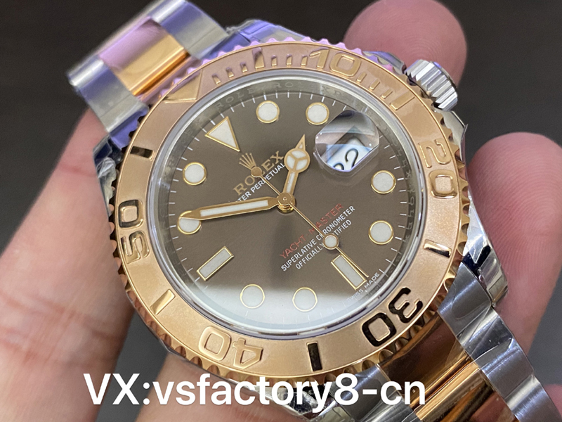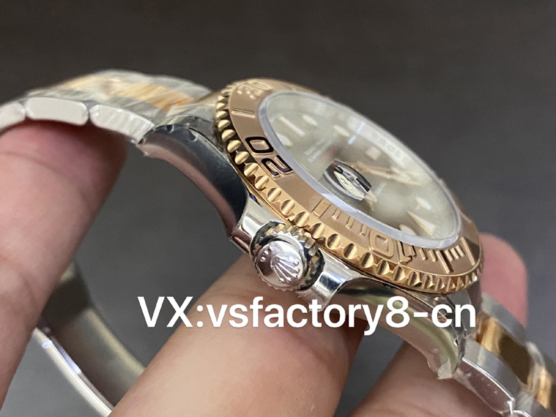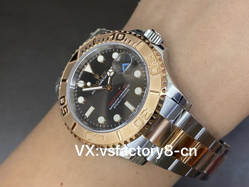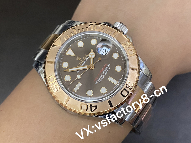 VS廠勞力士游艇玫瑰金巧克力復(fù)刻表的表殼側(cè)面纖薄修長、拋光效果閃耀靚麗,鎖頭護(hù)肩凹凸有致線條堅(jiān)挺柔和;