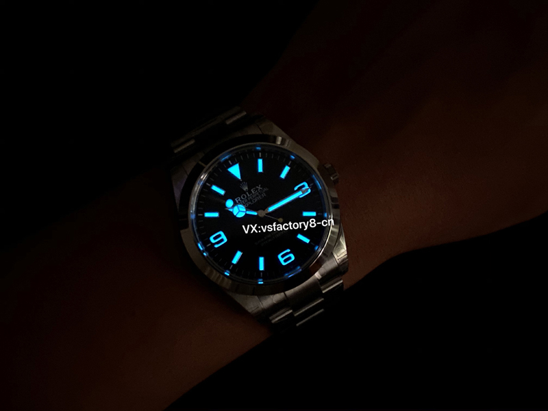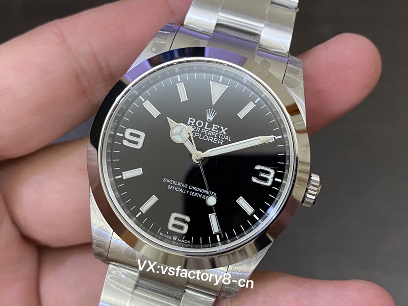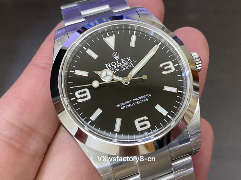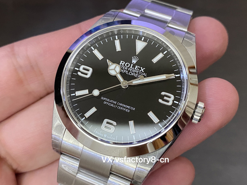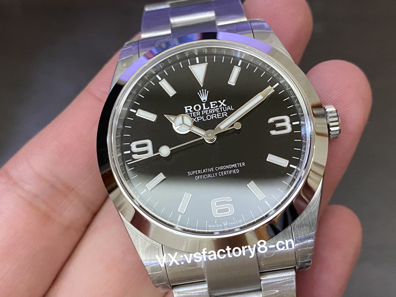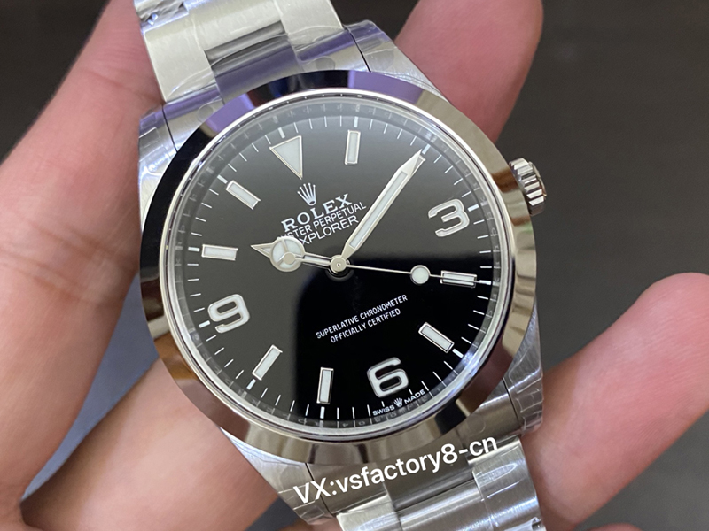從外觀上看,VS廠勞力士探險家使用經(jīng)典素雅的黑色盤面,指針為勞力士著名的“奔馳針”,這種指針樣式具有很高辨識度。