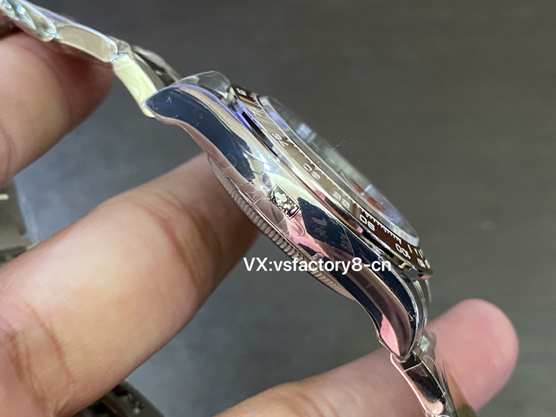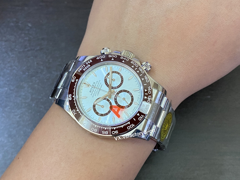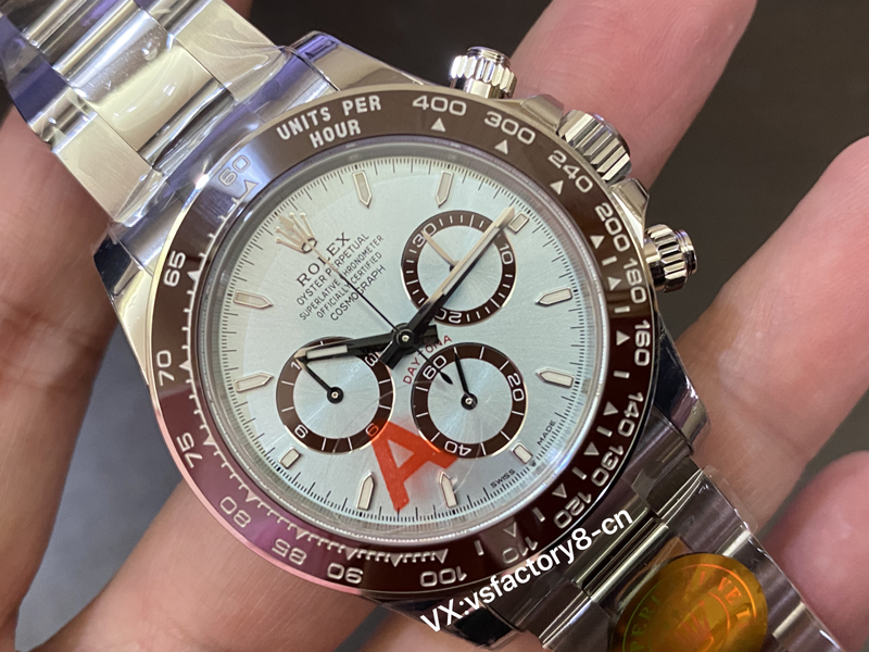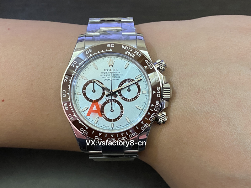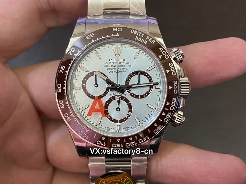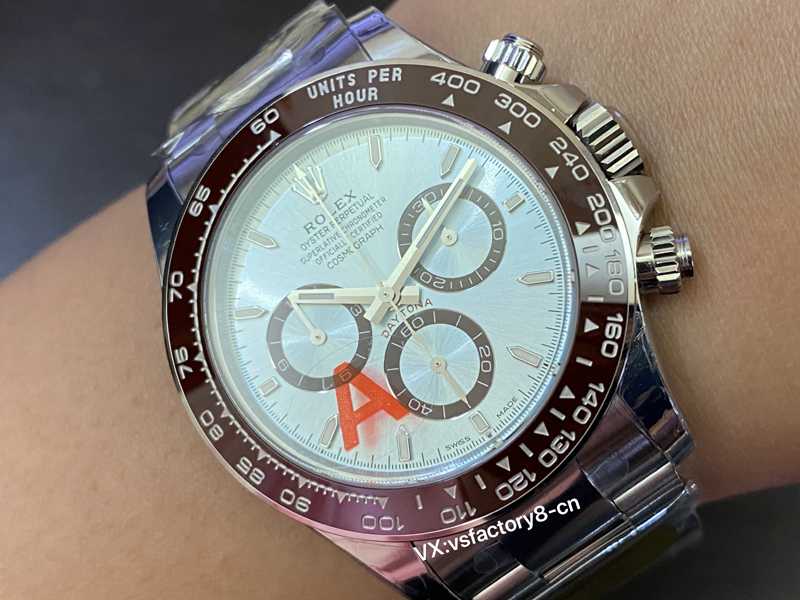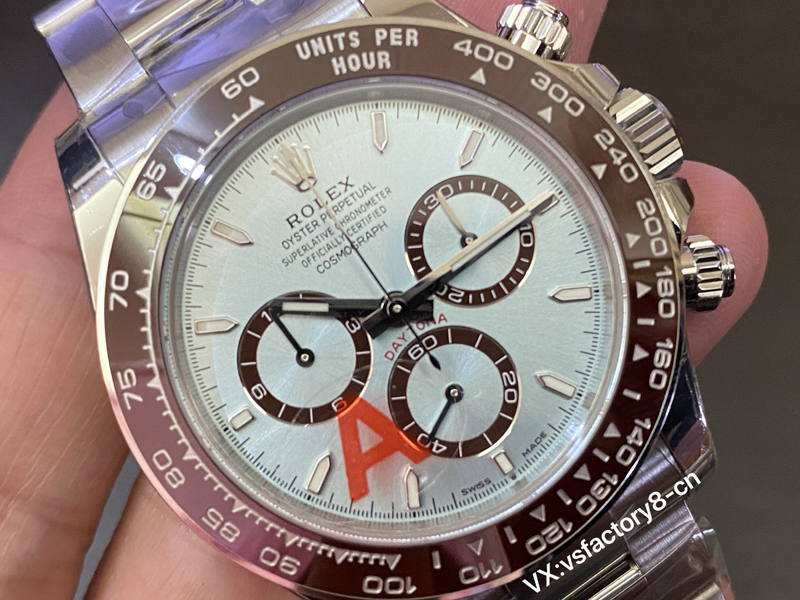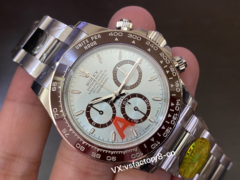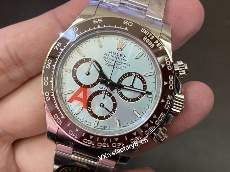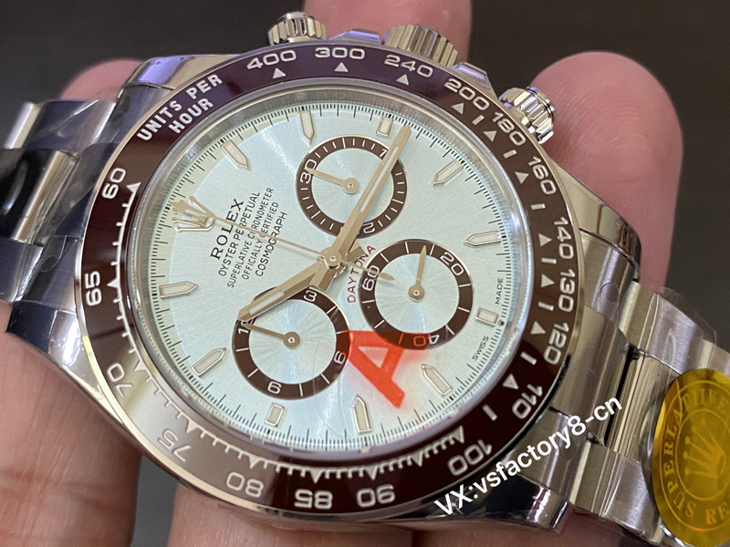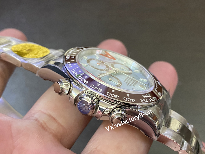 VS廠勞力士冰藍面迪通拿表盤藍色太陽紋普刻區(qū)別于鉆刻,藍色太陽紋更加沉穩(wěn)大氣,棕色陶瓷圈依舊單獨調(diào)色。